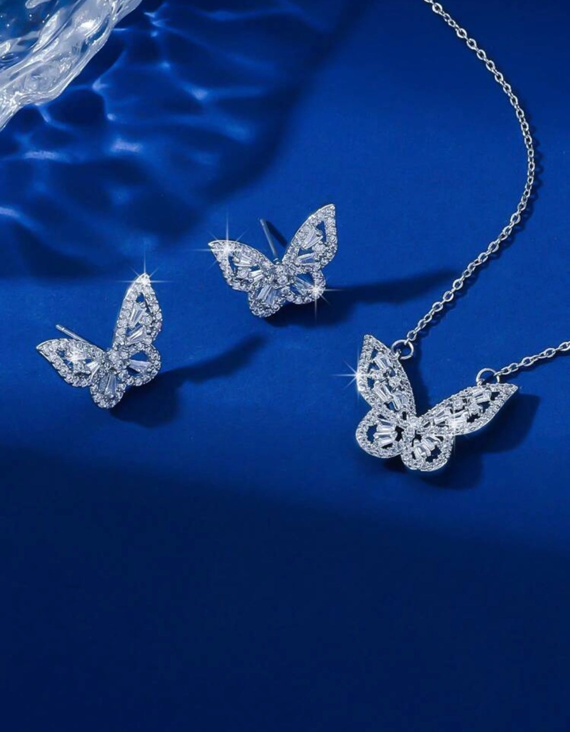 3pcs Butterfly Jewelry Set For Women, Include Stainless Steel Chain Necklace With Rhinestone Inlay Butterfly Pendant & Simple Butterfly Stud Earrings
