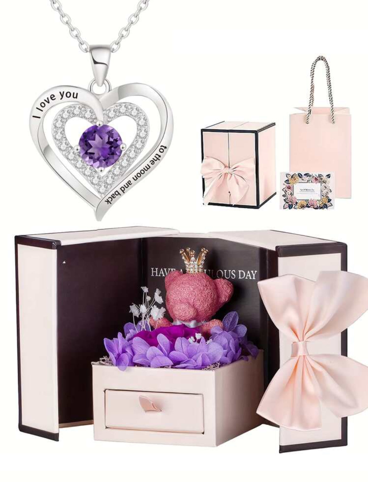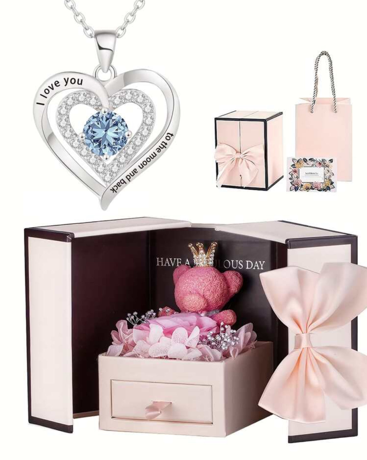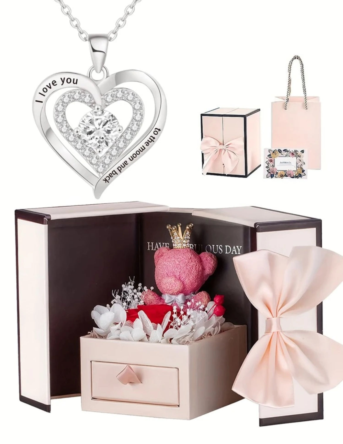 This gift set for her is the perfect way to express your love on Valentine's Day or your anniversary. The necklace and teddy bear showcase a cute and romantic design, making it a thoughtful and heartfelt gesture. Show your love with this beautiful set that will surely make her smile.