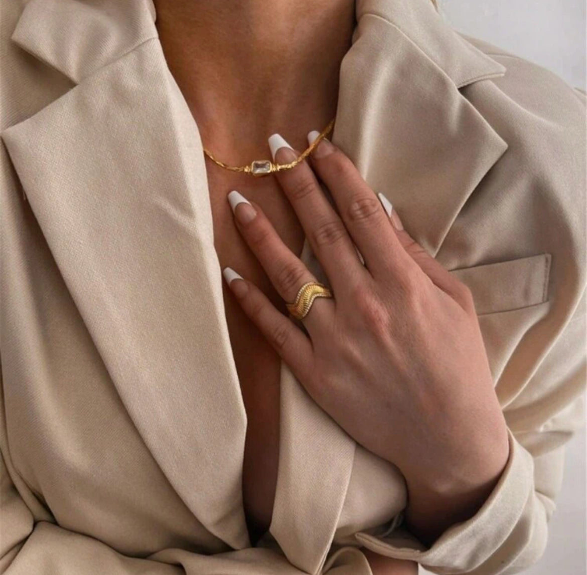 Crafted with sophistication and expertise, the Zuri Adornments Stainless Steel necklace boasts an elegant 18k gold plated snake chain and a sparkling rhinestone pendant. Elevate any outfit with its timeless and luxurious design.